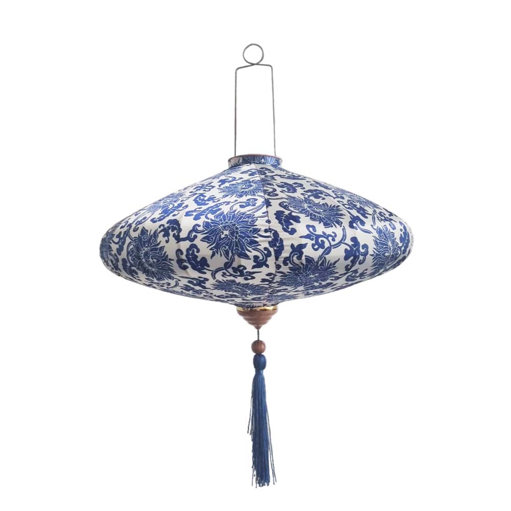 Коллекция подвесных фонарей ручной работы. Конструкция из шелкового полотна с цветочным орнаментом, металлического каркаса и подвесной системы. Модель в бело-синей цветовой гамме.